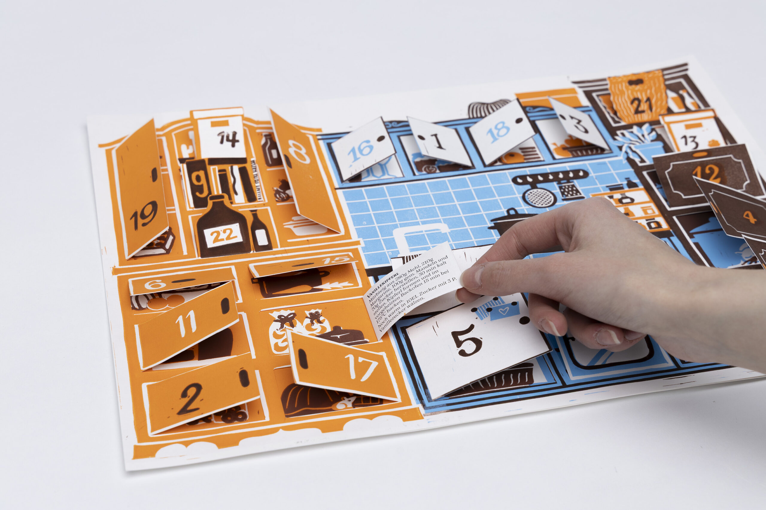Mit 24 Rezepten durch die Adventszeit In der Weihnachtsbäckerei, gibt’s so manche Leckerei… Zwischen Linolgedruckten Töpfen und Küchenschränken verstecken sich 24 weihnachtliche, vegetarische Rezepte. Von herzhaften Hauptgerichten, Suppen, Broten, bis hin zu Plätzchen, Nachtischen und sogar Cocktails ist für jeden etwas dabei. Jeder der Adventskalender ist in Handarbeit entstanden und besteht aus mehrfarbigen, originalen Linoldrucken.