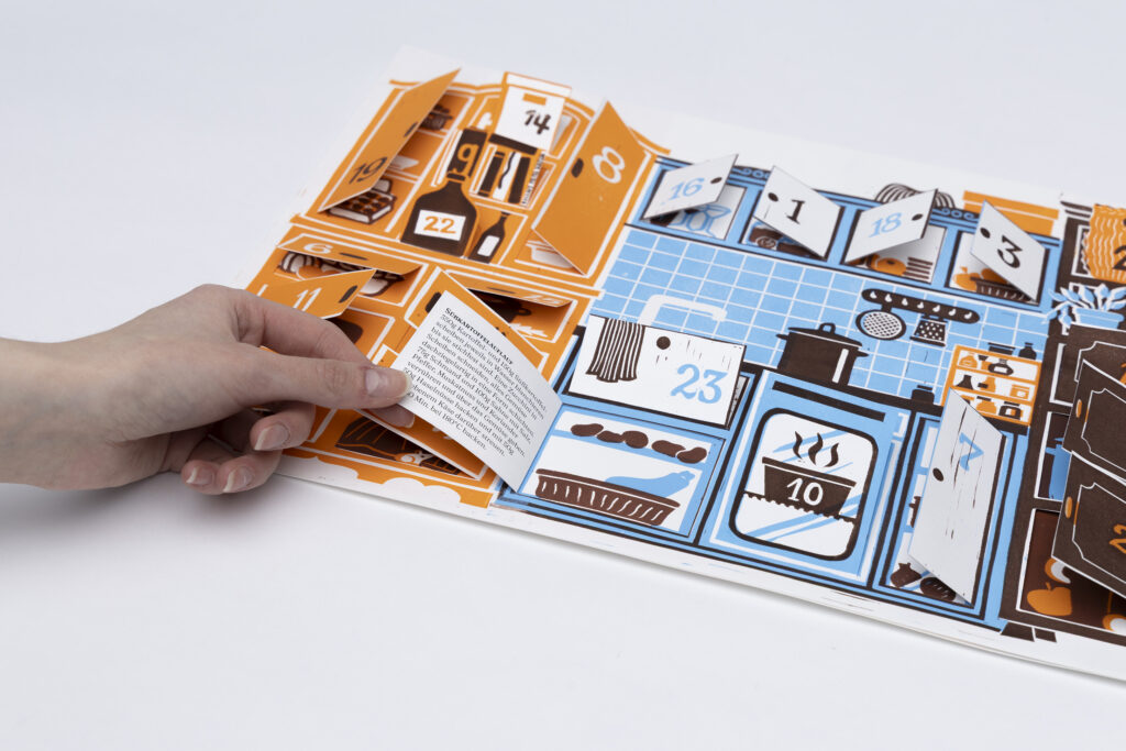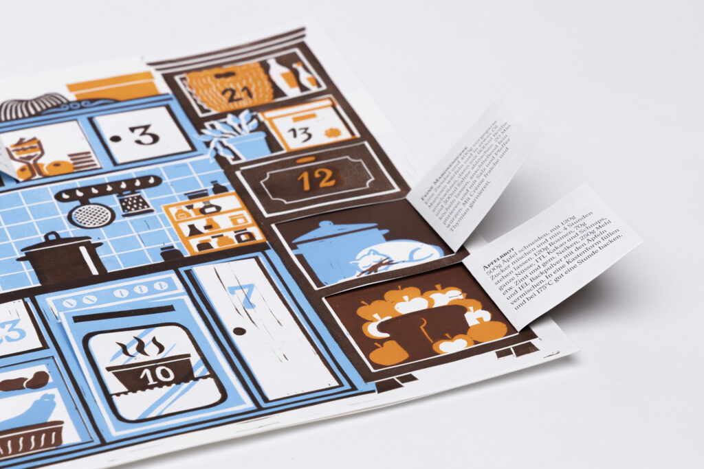 Außerdem liebe ich das Verbinden ungewöhnlicher Techniken und Ideen: So entstand dieser Adventskalender, ganz in Linoldruck. Hierfür schnitzte ich 4 Druckplatten. Der Kalender besteht aus zwei bedruckten Ebenen, diese sind jeweils dreifarbig gedruckt. Im Inneren finden sich liebevoll gestaltete Bildchen und unterschiedliche Rezepte.
