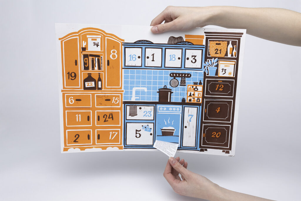 Zwischen Linolgedruckten Töpfen und Küchenschränken verstecken sich 24 weihnachtliche, vegetarische Rezepte. Von herzhaften Hauptgerichten, Suppen, Broten, bis hin zu Plätzchen, Nachtischen und sogar Cocktails ist für jeden etwas dabei. Jeder der Adventskalender ist in Handarbeit entstanden und besteht aus mehrfarbigen, originalen Linoldrucken.
